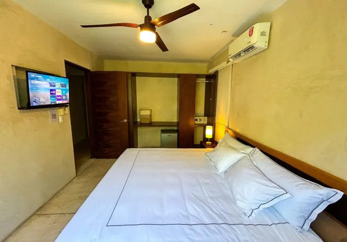 It features a private bathroom, air conditioning, a ceiling fan, and a 32" television.