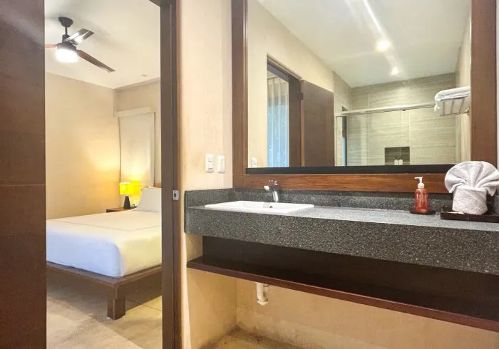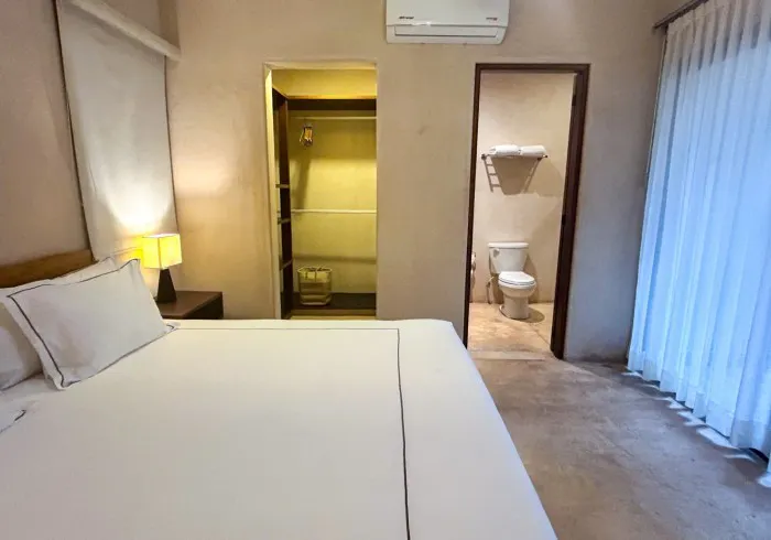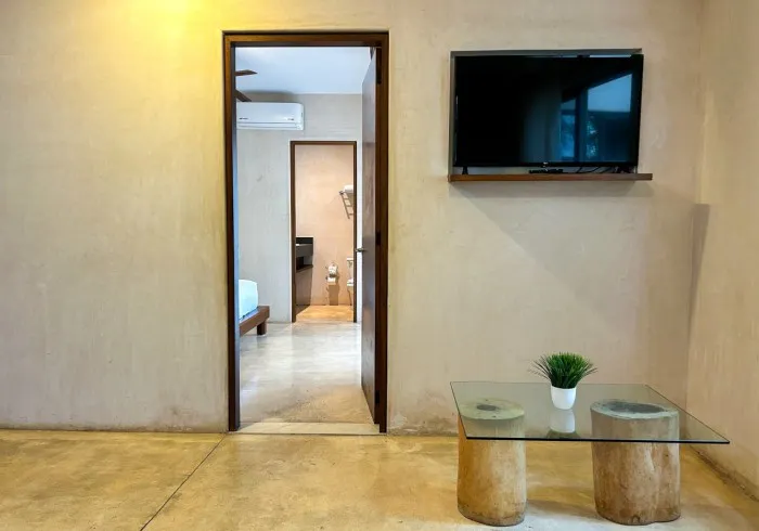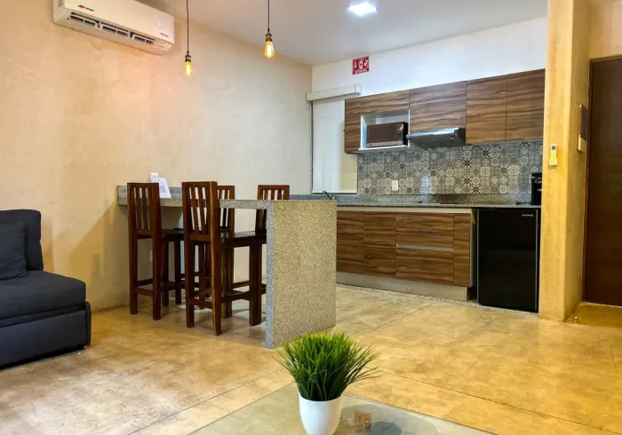 Includes a private bathroom, air conditioning, ceiling fan, and a 42" TV. The fully equipped kitchenette features an electric stovetop, refrigerator, microwave, coffee maker, and all necessary cookware, dishes, and utensils, so you can easily prepare your own meals.